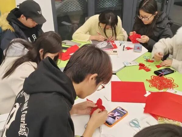 剪纸区同样气氛热烈。大家以红纸为媒,剪刀为笔,通过精心折叠与巧妙勾勒,创作出各式寓意吉祥的窗花、生肖与福字。每一幅作品皆构图精巧,线条流畅,既展现了传统剪纸技艺的独特韵味,也寄托了对新春佳节的美好祝愿。