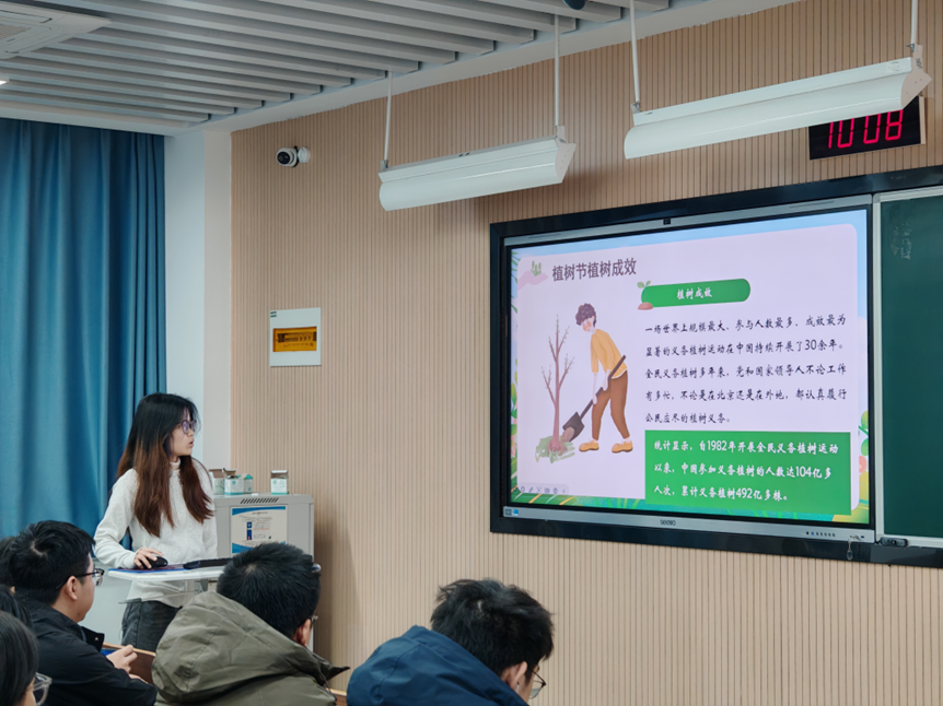 李娜霏首先给大家介绍了植树节节日的来源,植树节最初于1915年被孙中山先生倡议设立,后国民政府于1928年将植树节设立于3月12日,以纪念孙中山先生;1979年,全国人大常委会正式确立每年的3月12日为植树节。根据统计,从1982年植树节开始至2021年12月,中国适龄公民累计有175亿人次参加义务植树,累计植树781亿株(含折算)。爱绿植绿护绿的文明风尚、植树造林的责任意识持续增强提升。