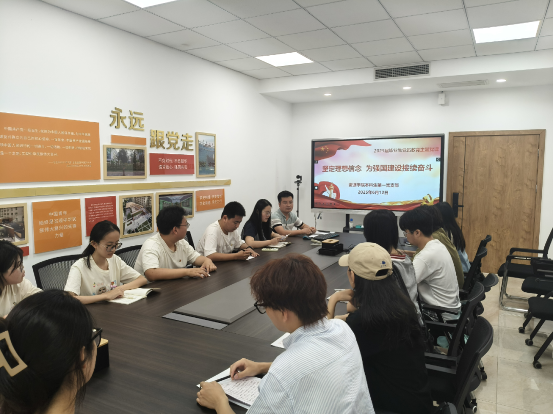 为深入贯彻落实党的二十大精神和党的二十届三中全会精神,教育引导毕业生党员在新的人生发展阶段继续坚定理想信念、勇担时代使命,6月12日10:30,资源学院本科生第一党支部于北校区朝晖园学生社区党建活动室开展毕业生党员教育主题党课活动。党支部书记巩昌盛主持活动,支部全体毕业生党员参与学习。