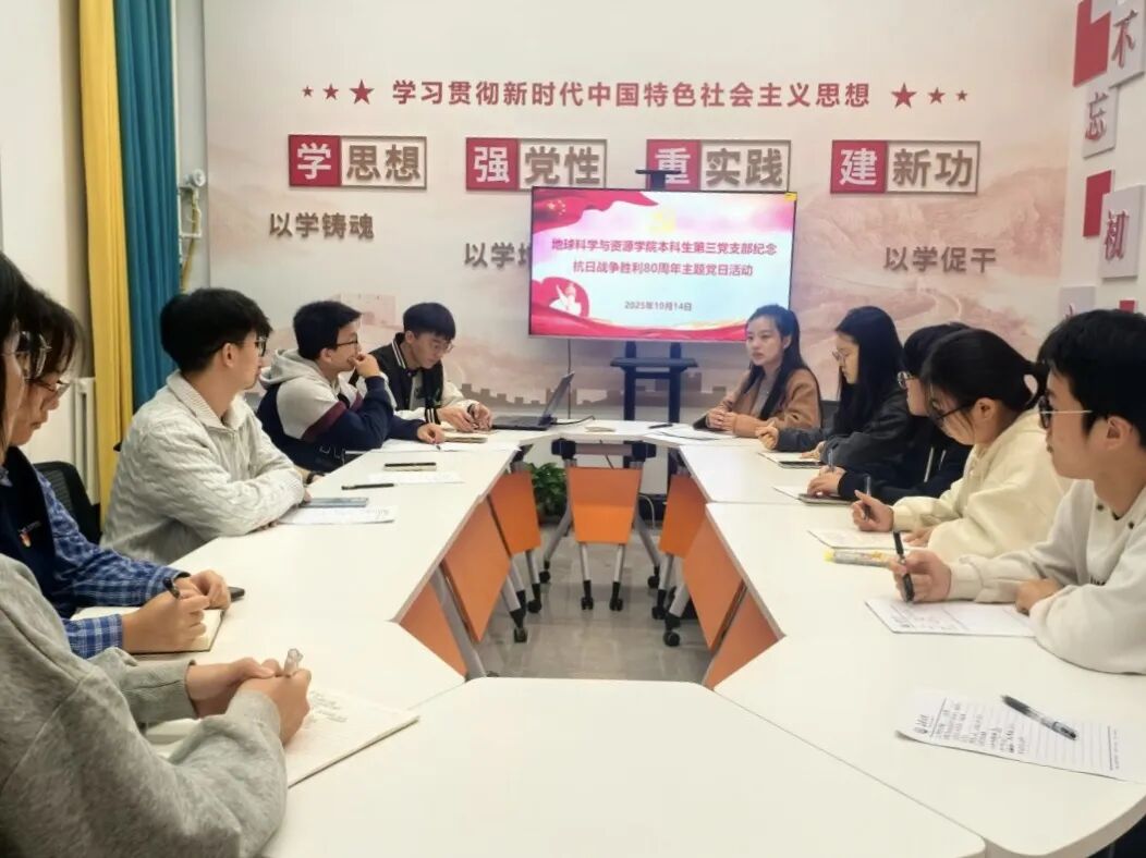 为深刻铭记中国人民抗日战争胜利80周年的重大历史意义,弘扬伟大抗战精神,引导全体党员筑牢理想信念、凝聚奋进力量,资源学院本科生第三党支部开展纪念中国人民抗日战争胜利80周年主题党日活动。本次活动由党支部书记张凤主持,全体党员参加。
